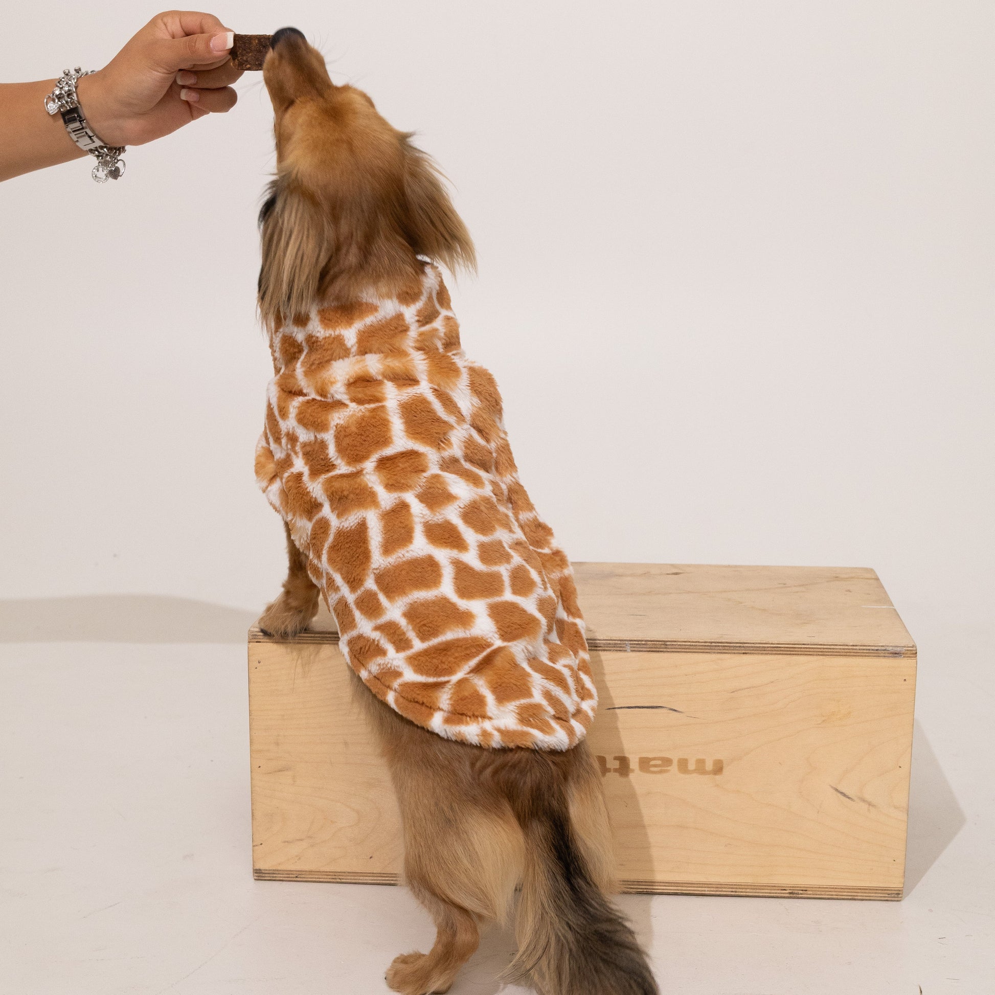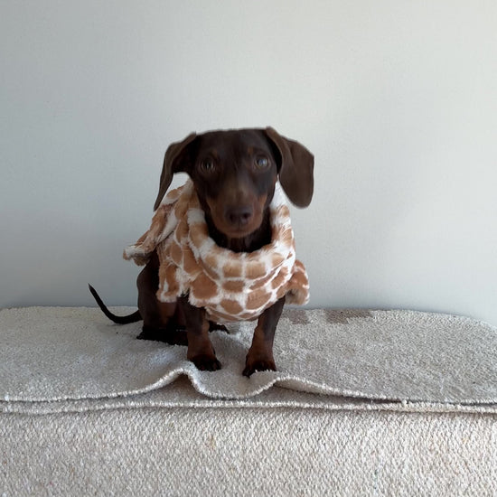 Keep your dachshund cozy and stylish with our ultra-soft minky Tall & Proud Giraffe Print. The patent-pending wraparound fit adjusts at the neck, chest, and belly, while step-in arm caps let your pup move freely.